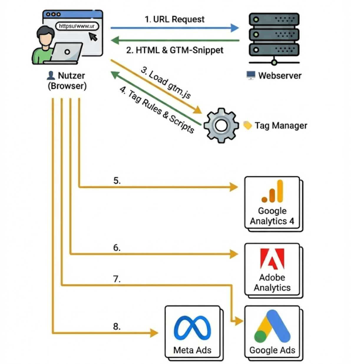 (5–8) Ausführung & Datenversand: Die Tags werden nun lokal im Browser des Nutzers ausgeführt. Die gesammelten Daten werden an die entsprechenden Dienste (GA4, Adobe Analytics, Google Ads, Meta-Ads) gesendet.